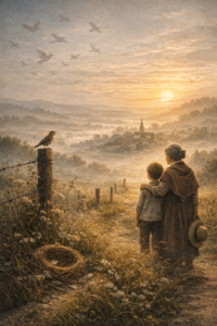 Ce soir-là, au crépuscule, un chant s’éleva. Un seul. Fragile comme une flamme dans le vent. Hésitant, presque surpris de lui-même — un oiseau solitaire, perché quelque part dans le vieux chêne du chemin, qui chantait comme si le monde pouvait encore l’entendre.