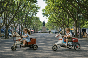 Ils étaient là, au milieu des allées Paul-Riquet, entre les platanes et les bancs de pierre. De petits chevaux en métal, un peu usés, montés sur roues, avec des pédales reliées par une chaîne. Pour avancer, il fallait pédaler vraiment, sentir la résistance, tourner lentement sur le tracé circulaire dessiné au sol.